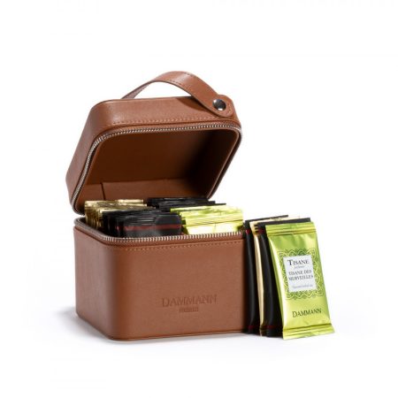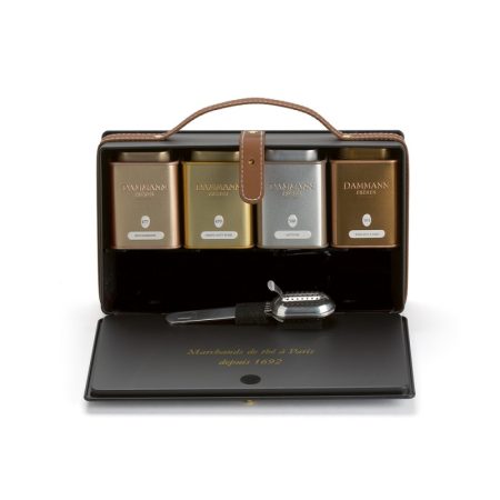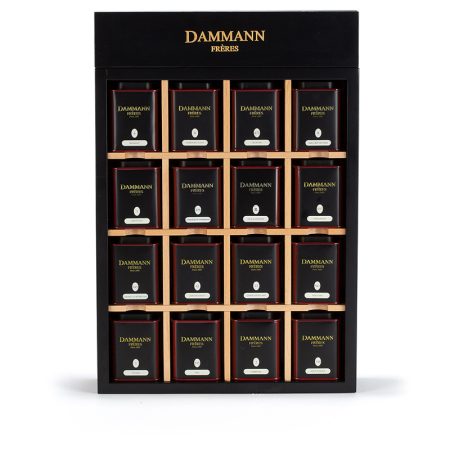 Elégant, ce précieux coffret en bois laqué, présente aux côtés d’un sablier, 18 thés et mélanges aromatisés sélectionnés parmi les créations Dammann Frères pour offrir, telle une cave à thé, à l’amateur comme au connaisseur des dégustations aux saveurs à chaque fois renouvelées.